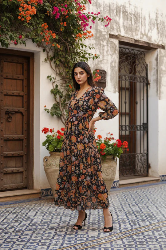 Blue Dot Ajrak Pallu Digtial Printed Satin Kaftaan